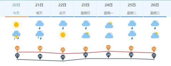 23~24日多云,南风3级,最高气温36℃左右。