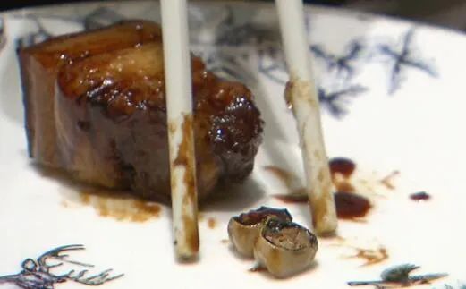 结果在吃红烧肉时,黄女士的大伯咬到了硬物,吐出一看,竟然是两颗假牙!!