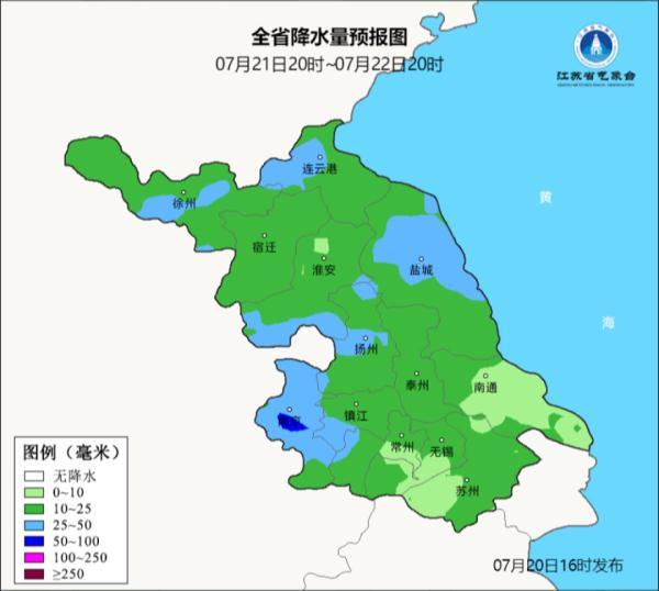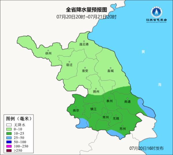 其中江淮之间南部和苏南东部地区中到大雨