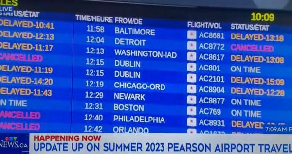 海外网7月20日电据美国“商业内幕”网站报道,当地时间7月18日,加拿大多伦多机场一名官员在发布会上自称准点率极大提高,而这名官员身后的航班信息屏幕上显示,大量航班延误或者取消。