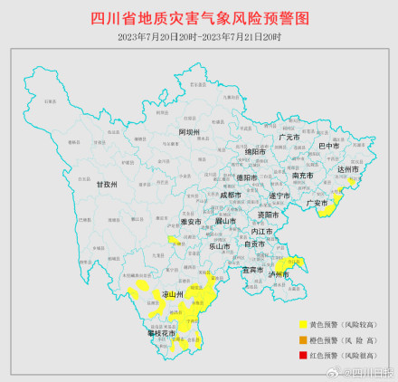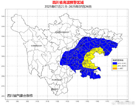 四川省气象台20日16时发布高温蓝色预警:21日到24日,广安、南充、遂宁、资阳、内江、自贡、宜宾、泸州8市和绵阳、德阳、成都、雅安、眉山、乐山6市东部,达州市南部,部分地方日最高气温可达35℃或以上,局部地方将超过38℃。此外,7月20日20时—21日20时,达州东南部局地,泸州中部,雅安西南部局地,广安、甘孜2市(州)东部局地,凉山州大部发生地质灾害的风险较高。请注意防范。(四川气象)