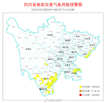 7月20日20时至7月21日20时,四川省地质灾害指挥部办公室发布全省地质灾害气象风险3级黄色预警。此次预警区域为:达州达川区、宣汉县、开江县、大竹县,广安华蓥市、邻水县,泸州江阳区、纳溪区、合江县、叙永县,雅安石棉县,甘孜州康定市、泸定县,凉山州西昌市、会理市、木里县、盐源县、德昌县、会东县、宁南县、普格县、布拖县、金阳县、昭觉县、喜德县、美姑县、雷波县等6市(州)27个县(市、区)。请相关地区做好防范工作。