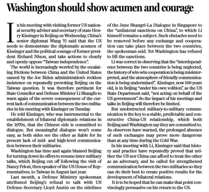 7月18日,中国国务委员兼国防部长李尚福在北京会见美国前国务卿基辛格,再次指出当前两军之间缺乏沟通存在的严重后果。