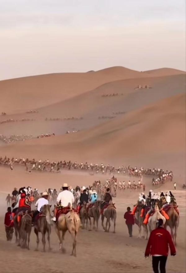 据了解,甘肃敦煌鸣沙山月牙泉景区为国家5A级景区,“大漠乘驼”是其特色项目,遇到节假日客流量较大,排队等待时间需要一个小时左右。