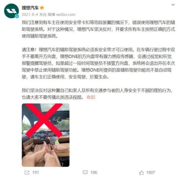 针对上述行为,理想汽车在2021年曾通过微博回应称,“理想汽车的辅助驾驶系统必须系安全带才可以使用。在车辆行驶过程中双手不要离开方向盘,理想ONE的方向盘带有握力感应传感器,会通过视觉和听觉报警提醒驾驶员,如果超过一段时间驾驶员不接管方向盘,系统将会退出并在本次驾驶中禁止使用辅助驾驶功能。”