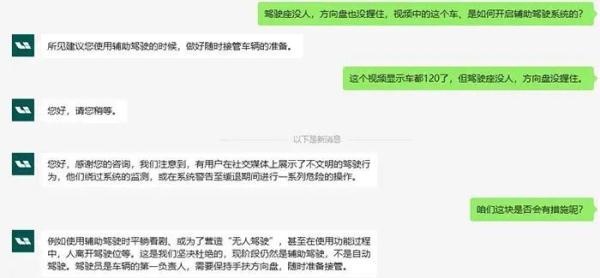 对此,理想汽车客服客服表示,例如使用辅助驾驶时平躺看剧、或为了营造“无人驾驶”,甚至在使用功能过程中,人离开驾驶位等,这是我们坚决杜绝的,现阶段仍然是辅助驾驶,不是自动驾驶。驾驶员是车辆的第一负责人,需要保持手扶方向盘,随时准备接管。