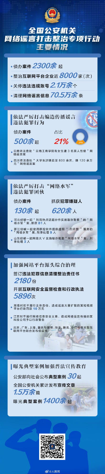 自今年4月10日开始,开展为期100天的网络谣言打击整治专项行动。行动期间,全国公安机关共侦办案件2300余起,整治互联网平台企业近8000家(次),依法关停违法违规账号2.1万余个,4月以来警方清理网络谣言70.5万余条,以强有力的实际行动整治网络谣言问题乱象,有效净化网络生态,积极营造清朗有序的网络环境。(人民网记者郝萍、梁秋坪)