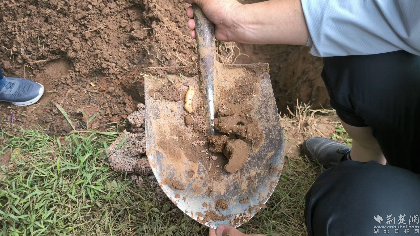 “白蚁主要取食植物的纤维,它活动的地方都带有泥被、泥线,人工挖巢就是通过这些活动痕迹找到蚁巢。目前我们在这里发现了一处白蚁老巢,巢深2米,窝巢直径60多厘米,蚁后长约5.5厘米。”雷艳齐说。