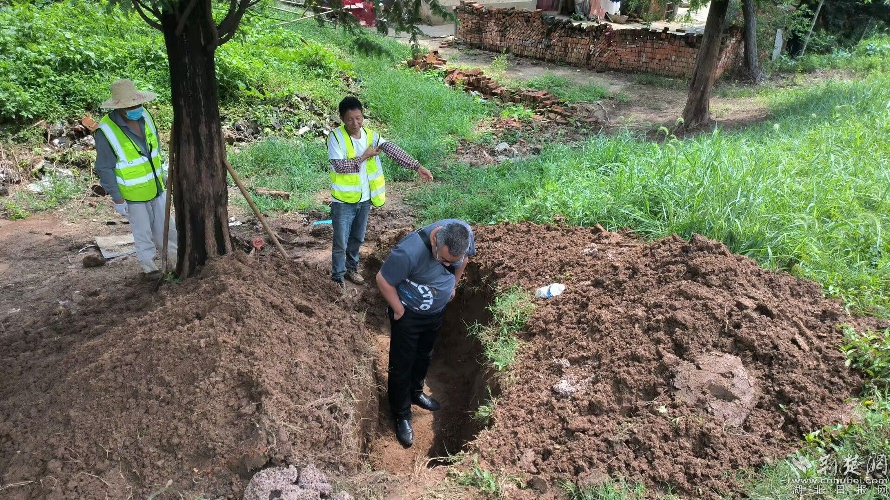7月19日,在云梦县漳河堤防(清明河乡红星村段)白蚁防治工地上,雷艳齐和他的同事们有的拿着铁锹,正在配合默契地清理蚁穴,有的蹲在地上观察被白蚁啃噬的树木,有的在喷洒灭蚁药物……