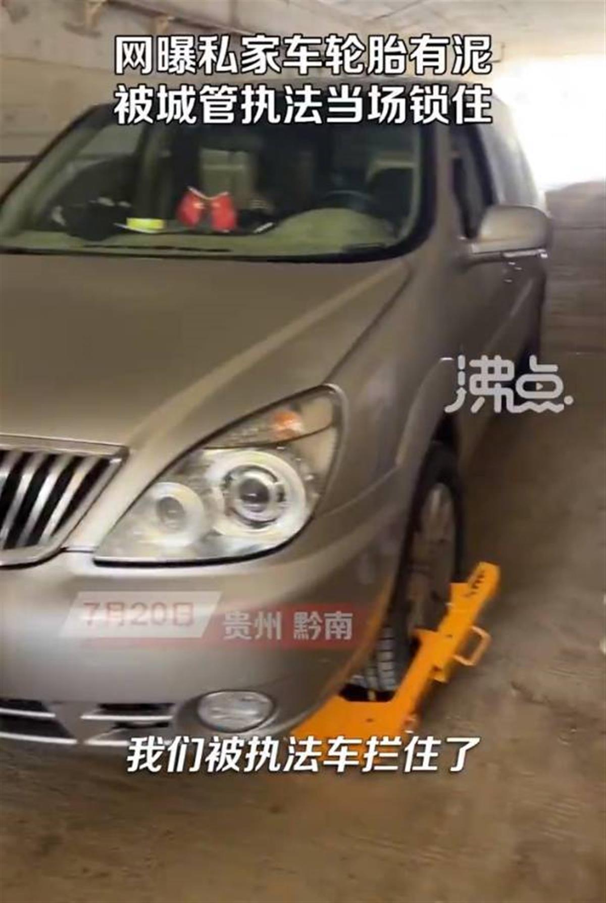 据7月21日中国新闻周刊,7月20日,网上传出,贵州从江县高铁站一辆山东牌私家车被城管现场执法锁住轮胎,理由是轮胎有泥禁止上路,引发热议。7月21日,从江县开发区城管工作人员表示确有此事,锁车原因为:车辆带泥上路,根据当地污染物防治条例锁车。当天已对车主进行了口头教育,后开锁放行,并未罚款。