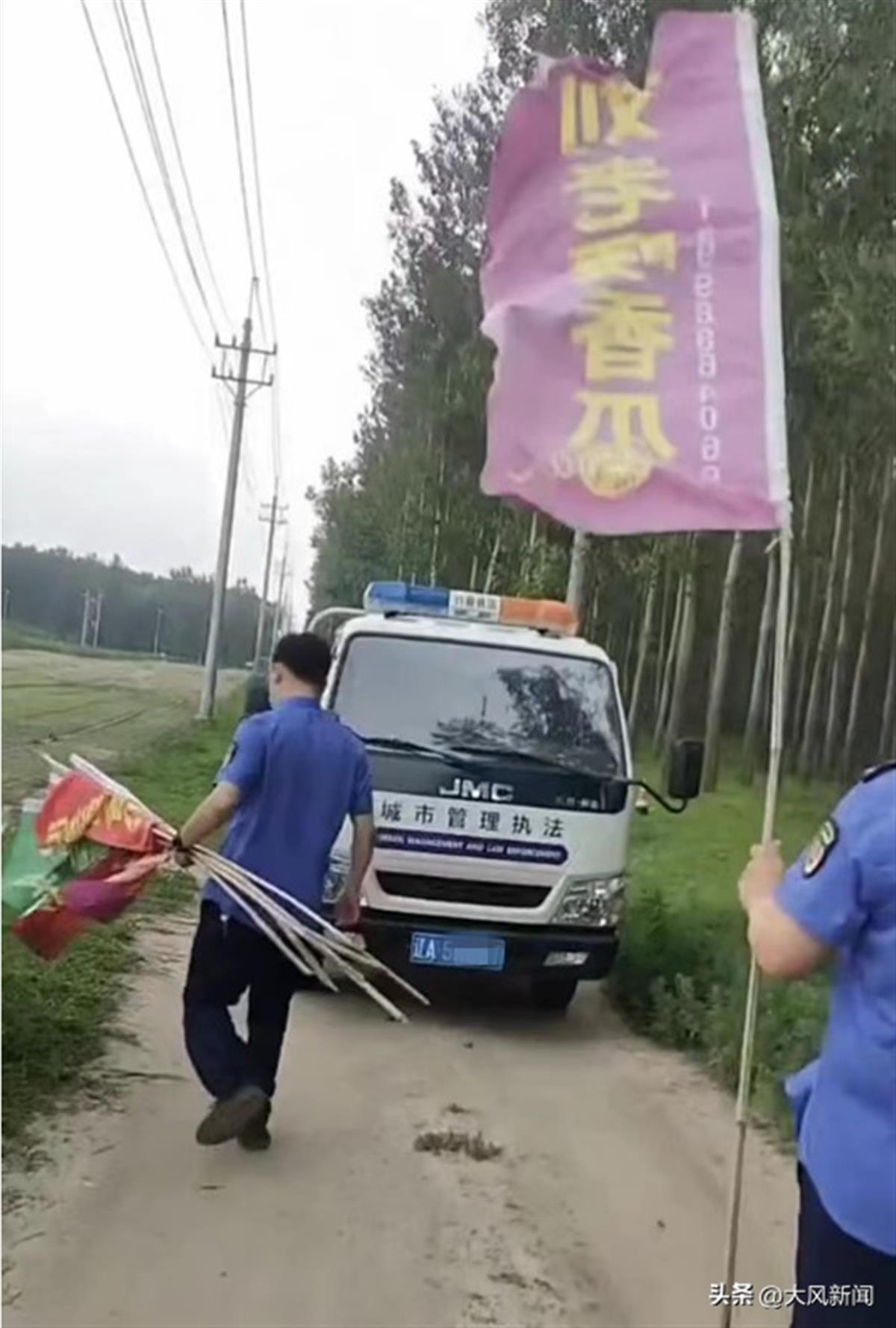 城管执法人员来田间将广告旗、条幅撕掉收走(来源:大风新闻)