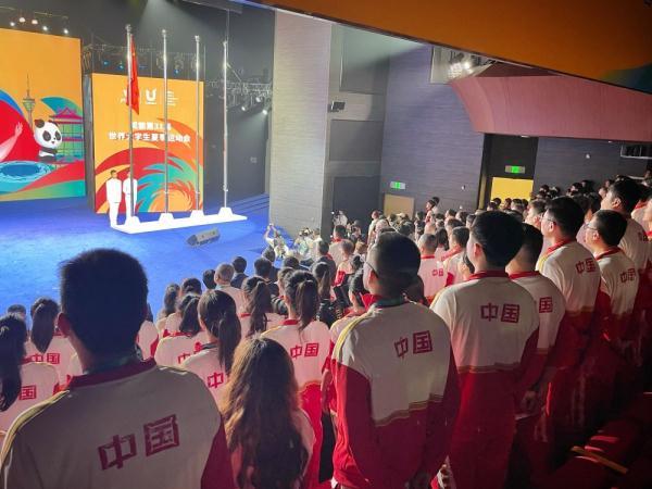 新华社成都7月22日电 22日,成都第31届世界大学生夏季运动会中国代表团欢迎仪式在大运村举行,现场举行了升旗仪式。