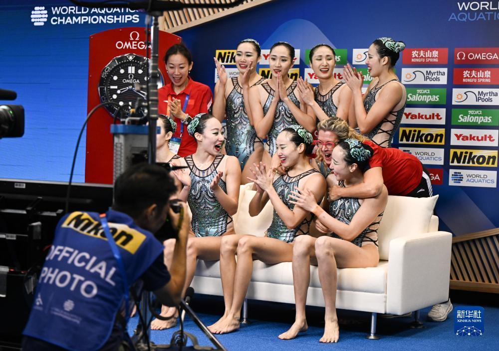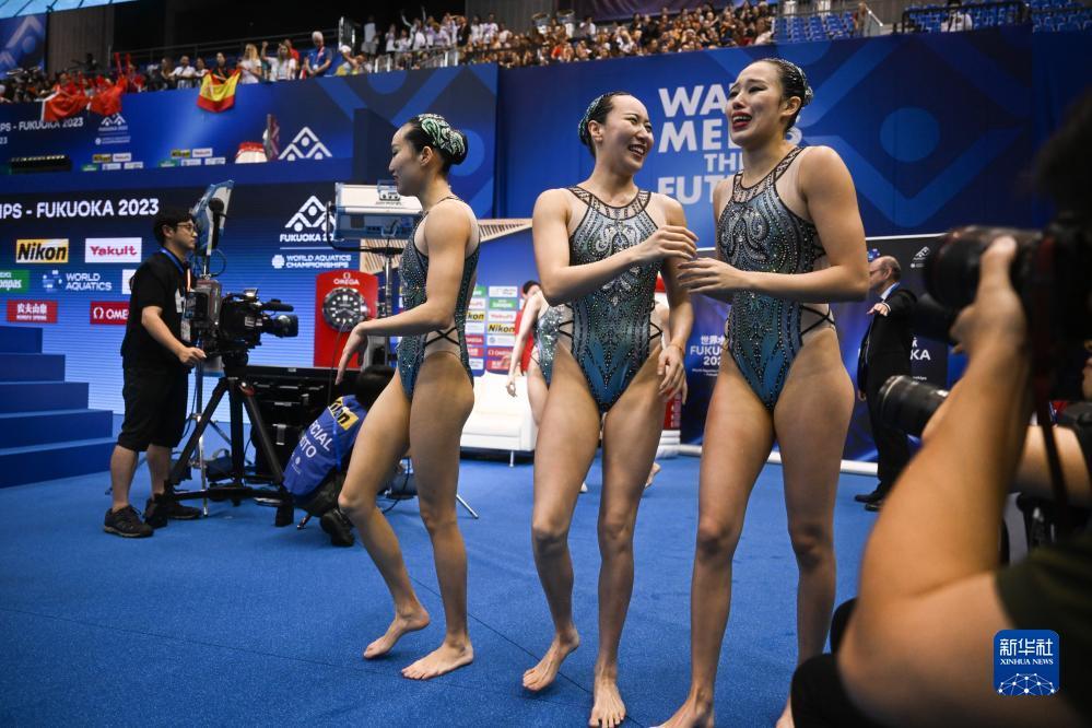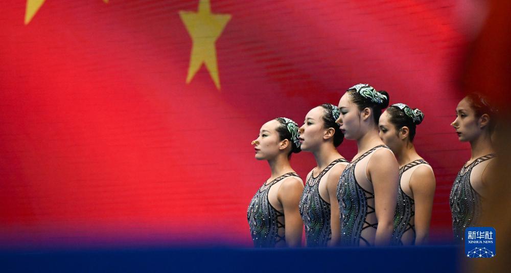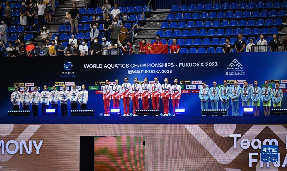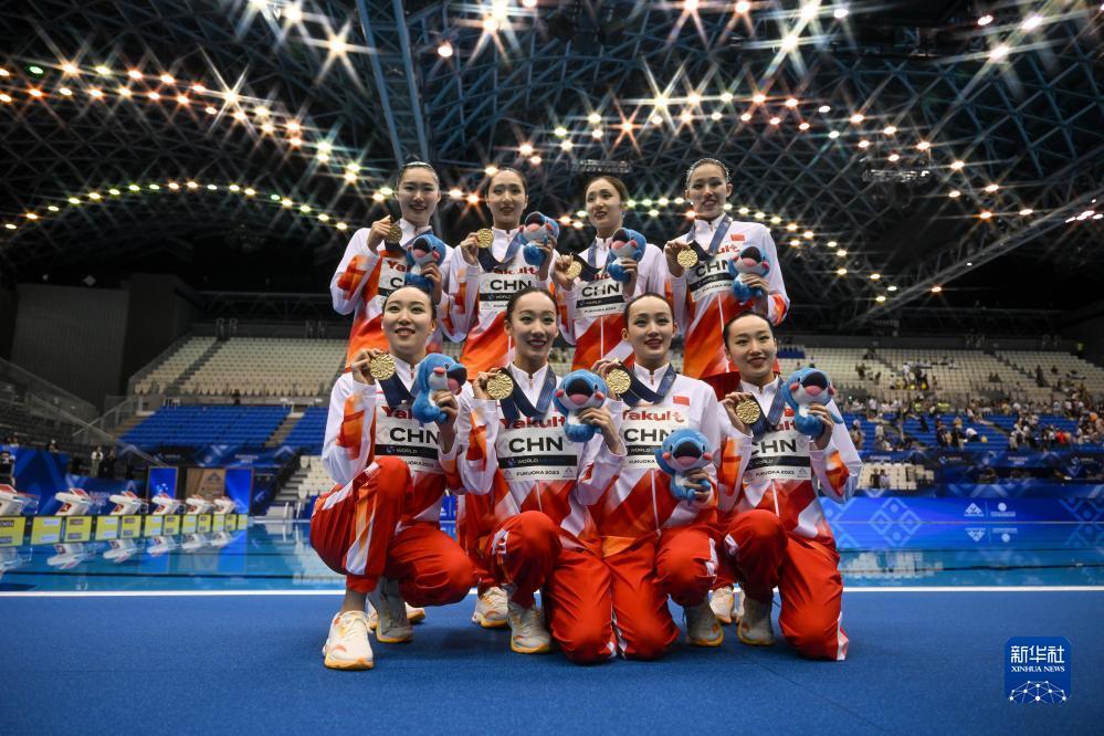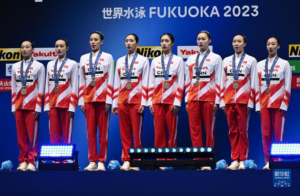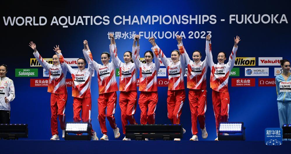 当日,在日本福冈举行2023年世界游泳锦标赛花样游泳集体自由自选决赛中,中国队以329.1687分的成绩获得冠军。