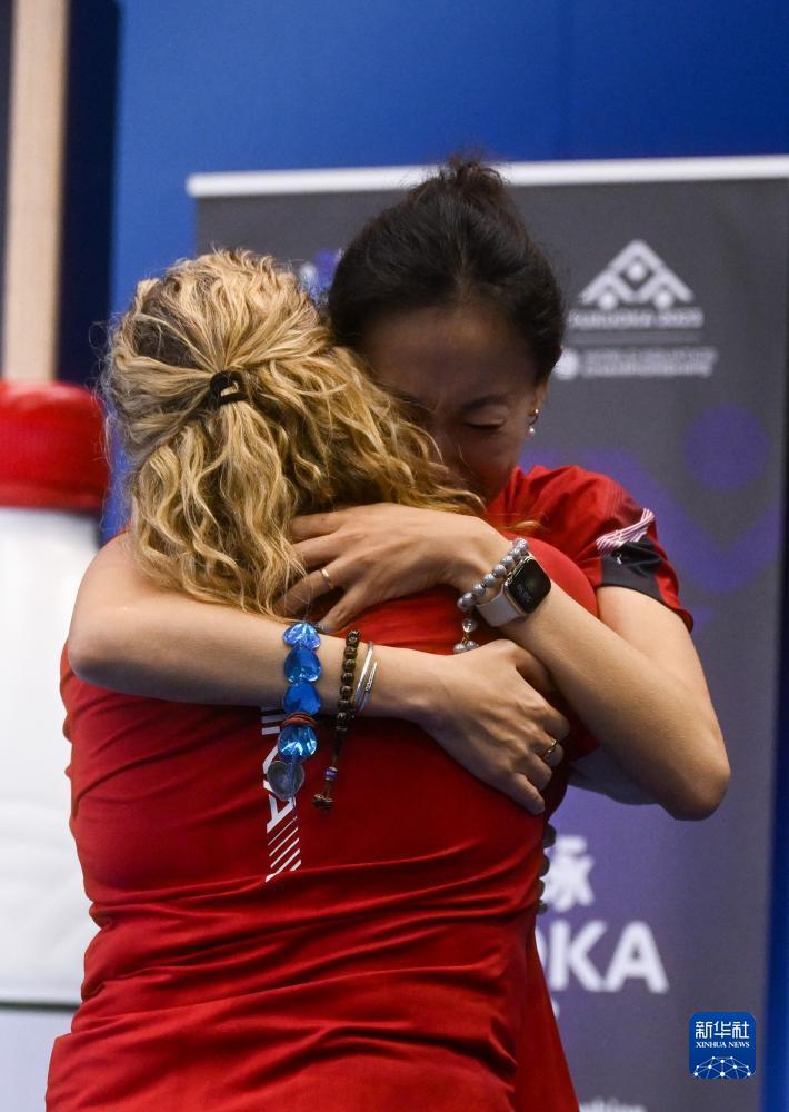 7月21日,中国队教练张晓欢(右)和安娜在赛后庆祝。新华社记者 夏一方 摄