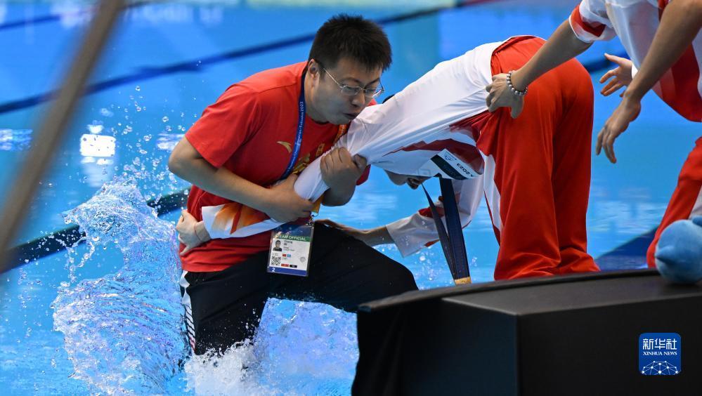 7月21日,中国队干事毕成(左)在颁奖仪式后被队员推进泳池庆祝。新华社记者 夏一方 摄