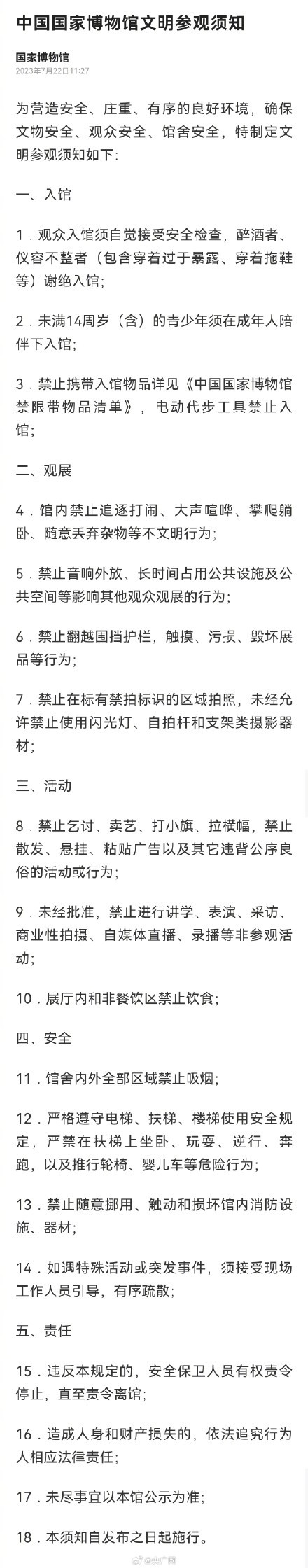 国家博物馆发布《中国国家博物馆文明参观须知》。