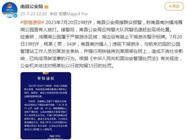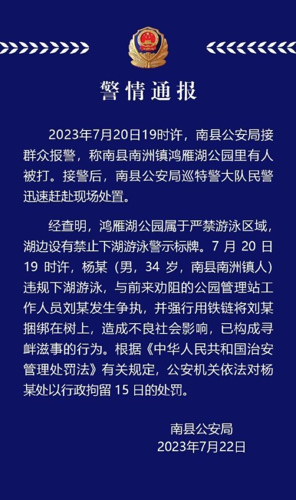 经查明,鸿雁湖公园属于严禁游泳区域,湖边设有禁止下湖游泳警示标牌。7月20日19时许,杨某(男,34岁,南县南洲镇人)违规下湖游泳,与前来劝阻的公园管理站工作人员刘某发生争执,并强行用铁链将刘某捆绑在树上,造成不良社会影响,已构成寻衅滋事的行为。根据《中华人民共和国治安管理处罚法》有关规定,公安机关依法对杨某处以行政拘留15日的处罚。