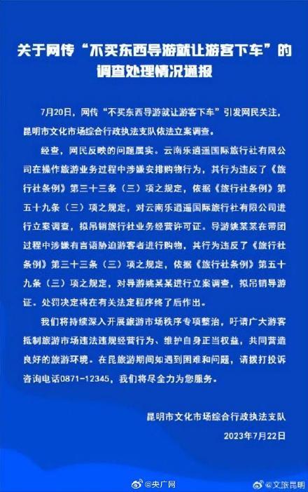 昆明市文旅局通报“不买东西导游就让游客下车”:导游被立案调查。通报全文