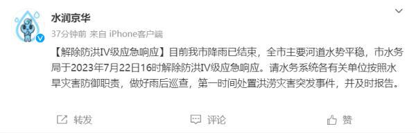 据“水润京华”微博消息,目前北京市降雨已结束,全市主要河道水势平稳,北京市水务局于2023年7月22日16时解除防洪Ⅳ级应急响应。请水务系统各有关单位按照水旱灾害防御职责,做好雨后巡查,第一时间处置洪涝灾害突发事件,并及时报告。