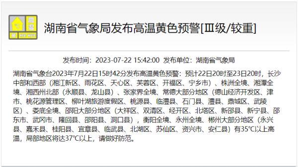 湖南省气象台2023年7月22日15时42分发布高温黄色预警:预计22日20时至23日20时,长沙中部和西部(湘江新区、雨花区、天心区、芙蓉区、开福区、宁乡市)、株洲全境、湘潭全境、湘西州北部(永顺县、龙山县)、张家界全境、常德大部分地区(德山经济开发区、津市、桃花源管理区、柳叶湖旅游度假区、桃源县、临澧县、石门县、澧县、鼎城区、武陵区)、娄底全境、邵阳大部分地区(大祥区、双清区、经开区、北塔区、新邵县、新宁县、邵东市、武冈市、隆回县、邵阳县、洞口县),衡阳全境、永州全境、郴州大部分地区(永兴县、嘉禾县、桂阳县、宜章县、临武县、北湖区、苏仙区、资兴市、安仁县)有35℃以上高温,局部地区将达37℃以上,请做好防范。