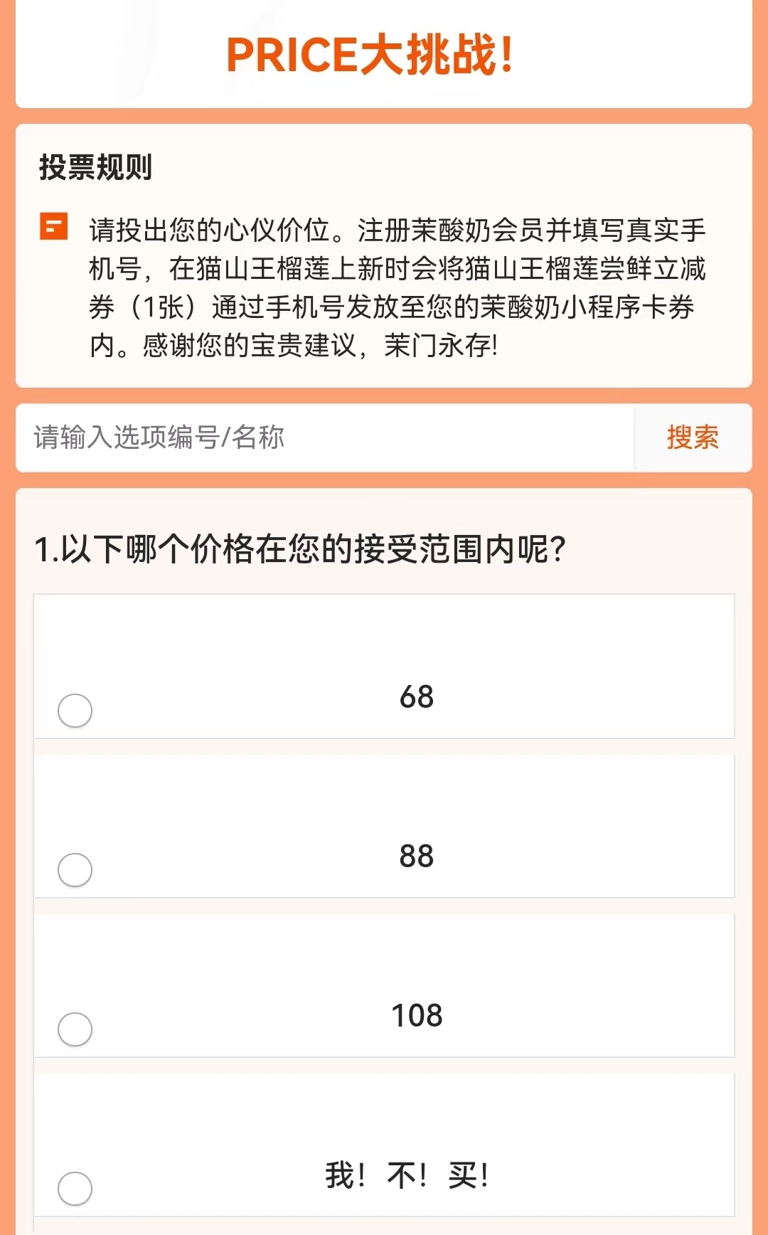 近日,茉酸奶上线了一份问卷调查,征集消费者对即将上新的猫山王榴莲奶昔的心理价位,三个价格选项分别为68元、88元、108元。并提到,“由于主打真材实料,无法避免昂贵的价格。”
