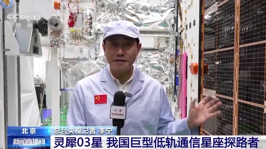 总台央视记者 李宁:这颗就是灵犀03星,从外形上看,它和我们传统意义上的卫星的形状完全不一样,那它是一个平板的状态,相当于一个我们汉字的“凸”字形。此外它所有的载荷都暴露在外,而且这颗卫星还是我国首次搭载了柔性太阳翼的卫星。