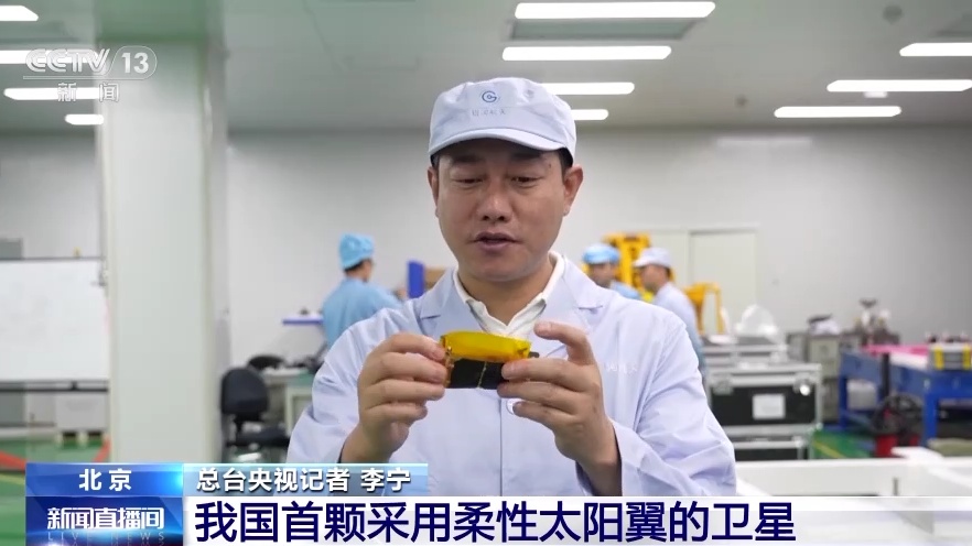 总台央视记者 李宁:这个就是最新的这种柔性太阳翼,和传统的这种刚性太阳翼相比,大家可以看一下,非常明显,无论是它的尺寸还是它的重量,可能都只有刚性太阳翼的几十分之一,但是它的发电量已经完全可以满足我们航天器在轨的这种需求。