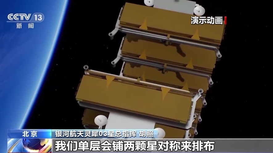 银河航天灵犀03星总指挥 胡照:我们未来发射的时候,因为我们运载火箭的一个截面是一个圆,所以我们为了利用这个圆的空间,我们单层会铺两颗星对称来排布,然后再一层一层罗列起来,这种方式基本上把整流罩的空间完全用满了。