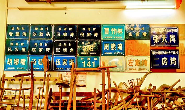 而在旁边的嵩山民俗文化博物馆,馆藏农村生产工具、纺织用具、家具器皿等各类民俗老物件760余件,包含明清时期的椅凳、桌案、床榻等古典家具和古人各类日常生活用品。在博物馆尽头,墙上贴满了各类村湾牌子。