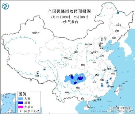 24日至26日,四川、重庆、贵州、云南北部等地有中到大雨,四川中南部、重庆南部、贵州北部等地的部分地区有暴雨,局地大暴雨。未来三天,江南、华南等地有35~37℃高温,局地超过37℃。