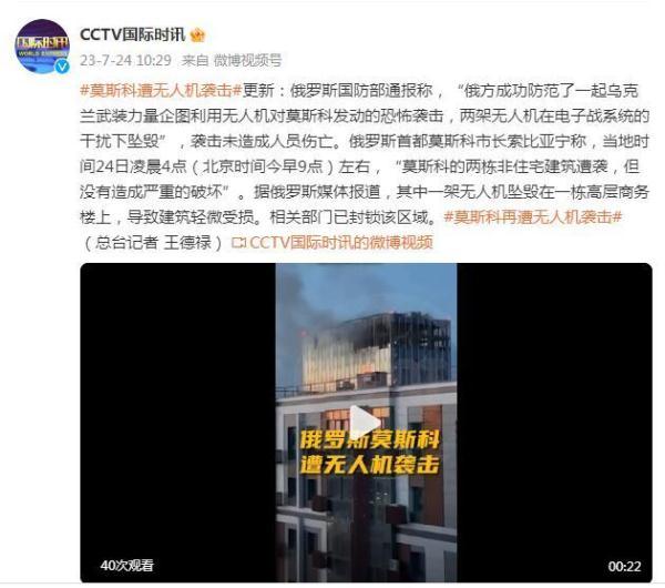 更新:俄罗斯国防部通报称,“俄方成功防范了一起乌克兰武装力量企图利用无人机对莫斯科发动的恐怖袭击,两架无人机在电子战系统的干扰下坠毁”,袭击未造成人员伤亡。俄罗斯首都莫斯科市长索比亚宁称,当地时间24日凌晨4点(北京时间今早9点)左右,“莫斯科的两栋非住宅建筑遭袭,但没有造成严重的破坏”。据俄罗斯媒体报道,其中一架无人机坠毁在一栋高层商务楼上,导致建筑轻微受损。相关部门已封锁该区域。(总台记者王德禄)