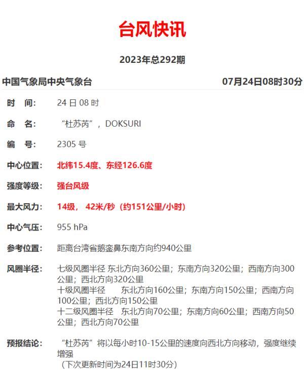 今年第5号台风“杜苏芮”的中心今天(24日)05时位于台湾省鹅銮鼻东南方向约970公里的菲律宾以东洋面上,就是北纬15.4度、东经127.0度,中心附近最大风力有13级(40米/秒),中心最低气压960百帕,七级风圈半径300-360公里,十级风圈半径100-160公里,十二级风圈半径50-70公里。