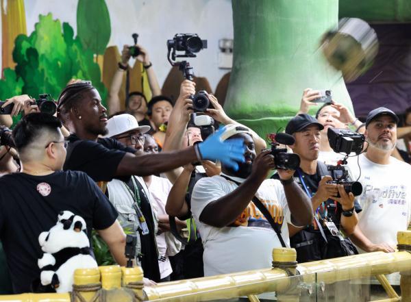7月23日,吉米·巴特勒(左二)在广州长隆旅游度假区投掷一个用竹篾编制的篮球。新华社记者 刘大伟 摄