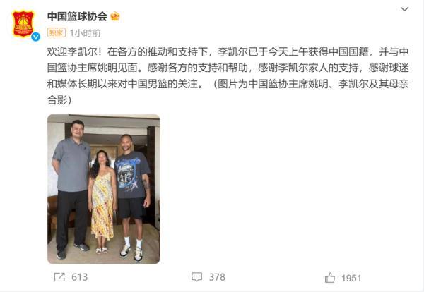 欢迎李凯尔!在各方的推动和支持下,李凯尔已于今天上午获得中国国籍,并与中国篮协主席姚明见面。感谢各方的支持和帮助,感谢李凯尔家人的支持,感谢球迷和媒体长期以来对中国男篮的关注。(图片为中国篮协主席姚明、李凯尔及其母亲合影)