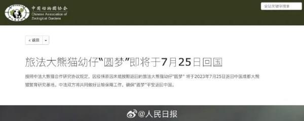 据中国动物园协会官网,按照中法大熊猫合作研究协议规定,因疫情原因未能按期返回的旅法大熊猫幼仔“圆梦”将于7月25日返回中国成都大熊猫繁育研究基地。中法双方将共同做好运输保障工作,确保“圆梦”平安返回中国。