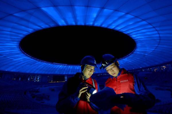 图为电力工人在东安湖体育公园主体育场开展末端负荷溯源工作