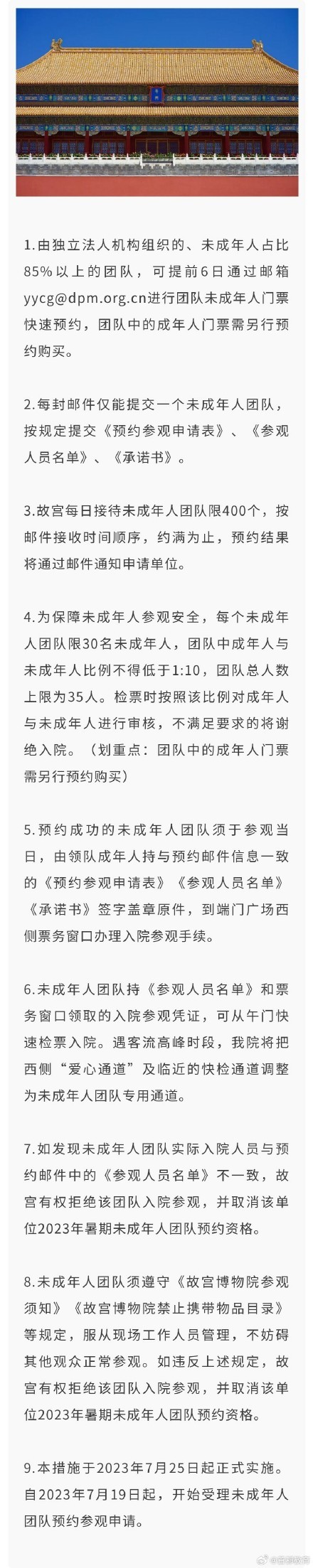 暑假期间,前来故宫博物院参观的未成年人团队数量激增。针对未成年人团队中成年人数量配比不足、检票速度缓慢等问题,故宫博物院特制定2023年暑期未成年人团队快速预约、检票措施。戳图了解