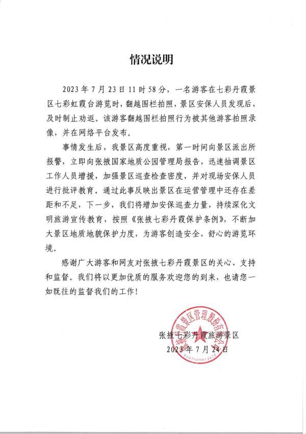 公告称:2023年7月23日11时58分,一名游客在七彩丹霞景区七彩虹霞台游览时,翻越围栏拍照,景区安保人员发现后,及时制止劝返。该游客翻越围栏拍照行为被其他游客拍照录像,并在网络平台发布。事情发生后,景区高度重视,第一时间向景区派出所报警,立即向张掖国家地质公园管理局报告,迅速抽调景区工作人员增援,加强景区巡查检查密度,并对现场安保人员进行批评教育。