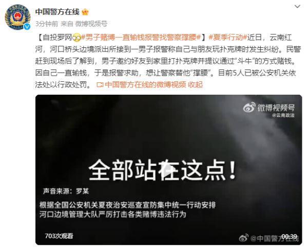 近日,云南红河,河口桥头边境派出所接到一男子报警称自己与朋友玩扑克牌时发生纠纷。民警赶到现场后了解到,男子邀约好友到家里打扑克牌并提议通过“斗牛”的方式赌钱。因自己一直输钱,于是报警求助,想让警察替他“撑腰”。目前5人已被公安机关依法处以行政处罚。
