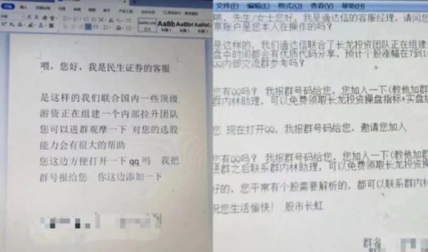 “您好,我是某证券公司客服,近期我们联合国内一些顶级团队组建了一个内部交流群,对您选股会有很大帮助,我把群号发给您......”