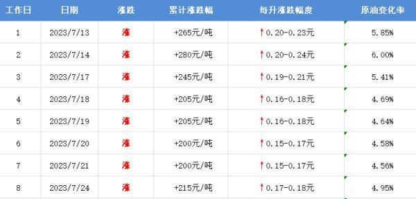 7月24日,本轮油价计价统计周期第8个工作日,当前参考原油变化率为4.95%,预计汽柴油累计上调215元/吨,折算为每升油价预涨0.17-0.18元。