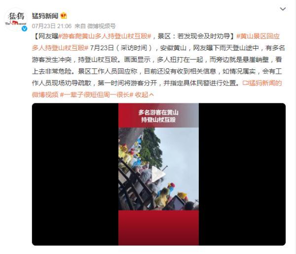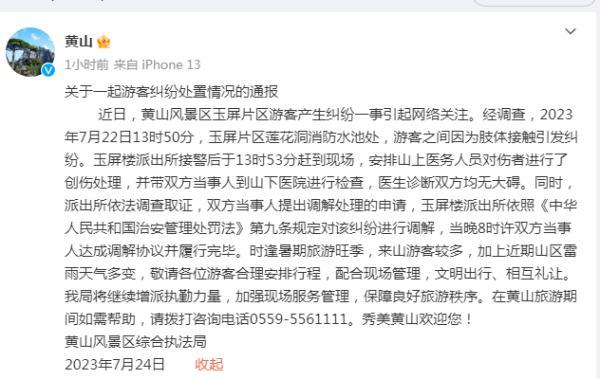近日,黄山风景区玉屏片区游客产生纠纷一事引起网络关注。经调查,2023年7月22日13时50分,玉屏片区莲花洞消防水池处,游客之间因为肢体接触引发纠纷。玉屏楼派出所接警后于13时53分赶到现场,安排山上医务人员对伤者进行了创伤处理,并带双方当事人到山下医院进行检查,医生诊断双方均无大碍。同时,派出所依法调查取证,双方当事人提出调解处理的申请,玉屏楼派出所依照《中华人民共和国治安管理处罚法》第九条规定对该纠纷进行调解,当晚8时许双方当事人达成调解协议并履行完毕。