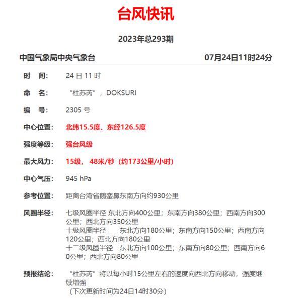 今年第5号台风“杜苏芮”已于24日上午8点钟由台风级增强为强台风级,其中心位于我国台湾省鹅銮鼻东南方大约940公里的菲律宾吕宋岛以东洋面上。