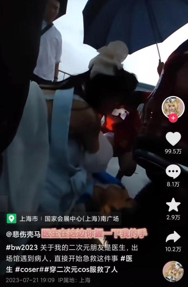 7月21日的上海狂风暴雨,在上海线下展会 BilibiliWorld2023漫展场馆外,一名男子突然晕厥倒地。看到这一幕,一位穿cos服的女生立即冲上前查看情况,并冒着雨跪地进行紧急施救。这个视频被发到了网上,“穿二次元cos服救了人”随即冲上热搜,大家纷纷夸赞这个女孩是“二次元天使”,而救人女孩则表示自己只是做了作为一名医生该做的事。