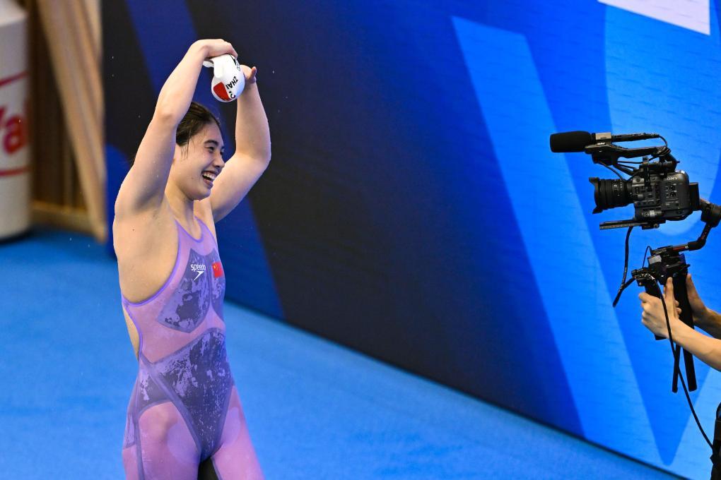 覃海洋摘金短短几分钟后,中国蝶泳名将张雨霏在女子100米蝶泳决赛中以56秒12的成绩获得冠军,如愿以偿地摆脱了世锦赛“铜牌专业户”的称呼,夺得个人首枚世锦赛金牌。虽然在东京奥运会拿到200米蝶泳冠军,但张雨霏在世锦赛上一直不太顺利,在2022年布达佩斯世锦赛女子蝶泳从50米到200米三个距离的比赛中全部获得铜牌。