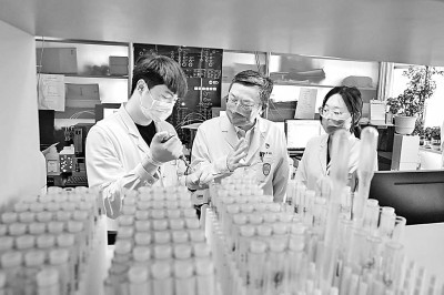 6月30日,中国医学科学院学部委员、我国著名血液病专家黄晓军(中)在北京大学血液病研究所指导学生做实验。新华社发