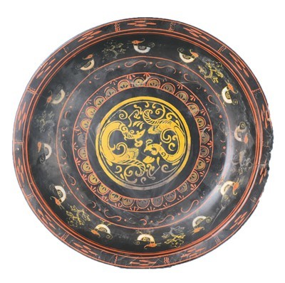 楚国漆器是楚文化最鲜明的特色之一。寿县双桥镇出土的战国彩绘鸟纹漆盘,外髹黑漆,内髹深褐色漆,并以红、黄、白三色漆彩绘纹饰。盘中央绘有两只呈环绕状的黄色凤鸟,两鸟之间绘花卉。向外为一周草叶纹带,再向外是一周红漆勾线“S”和点纹相间的纹带,最外围饰一周花鸟纹带,盘沿用红漆绘制点线相间的纹带。此盘画工精细,色彩艳而不俗,是战国时期罕见的漆器珍品。