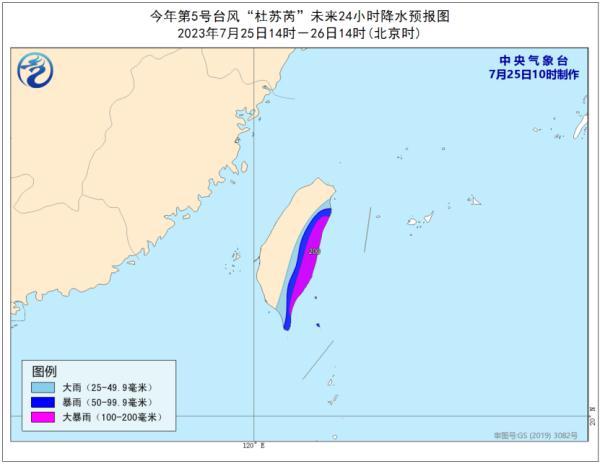 降水预报:25日14时至26日14时,台湾岛东部有大到暴雨,部分地区大暴雨(100-200毫米)。