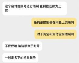 客服人员同时透露,被举报的用户将会面临封号处理,即丧失登陆权限在内的所有权限。在调查人员进一步追问处理的是什么账号,以及可能绑定的淘宝账号和支付宝账号是否会受到限制时,客服表示处理只限于闲鱼平台的这一账号,对于其他账号无法处理。