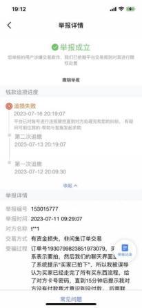 7月12日晚8点,经过1天半的等待,平台判定鲍女士举报成立,并显示开始第一次追损,但鲍女士发现平台对买家账号没有任何处置措施,仍能看到对方在线。7月16日,对方账号显示异常。7月17日,平台以“两次追损失败”告终。